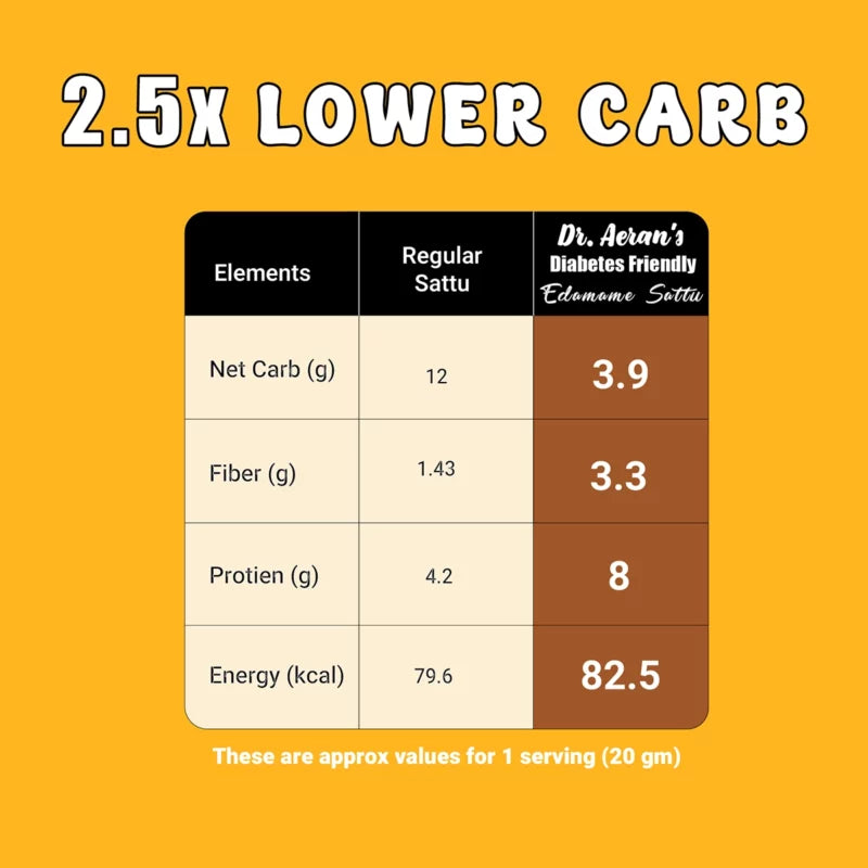 Dr. Aeran’s Diabetes-Friendly Edma Sattu is a carefully crafted, innovative blend of roasted edamame and roasted gram, designed to lower carbohydrate intake while boosting protein content. This low-glycemic, high-fiber, and protein-rich sattu is ideal for diabetics and health-conscious individuals aiming to maintain stable blood sugar levels. Made with 100% natural ingredients and free from preservatives, it provides a wholesome, versatile option for drinks, meal replacements, or snacks. Experience the authentic taste of sattu reimagined for a healthier, diabetes-friendly lifestyle that promotes fullness and supports your wellness goals.