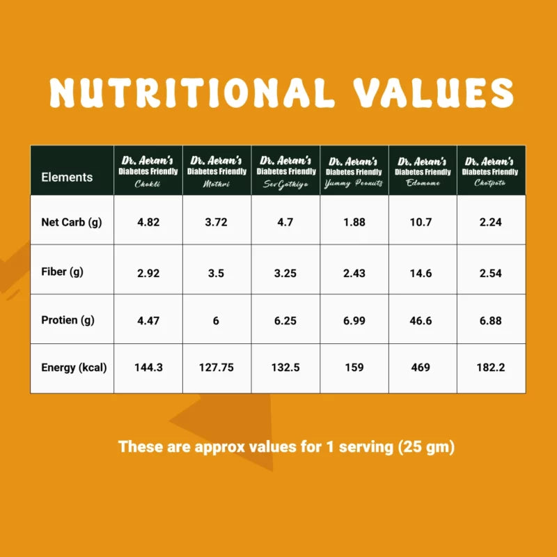 LOW GLYCEMIC IMPACT (GL): Dr. Aeran’s Snacks, such as Mathri, Chakli, Sev Gathiya, Yummy Peanut, Chatpata, and Edamame Beans, are crafted with a low glycemic index, making them perfect for blood sugar management and diabetes control.