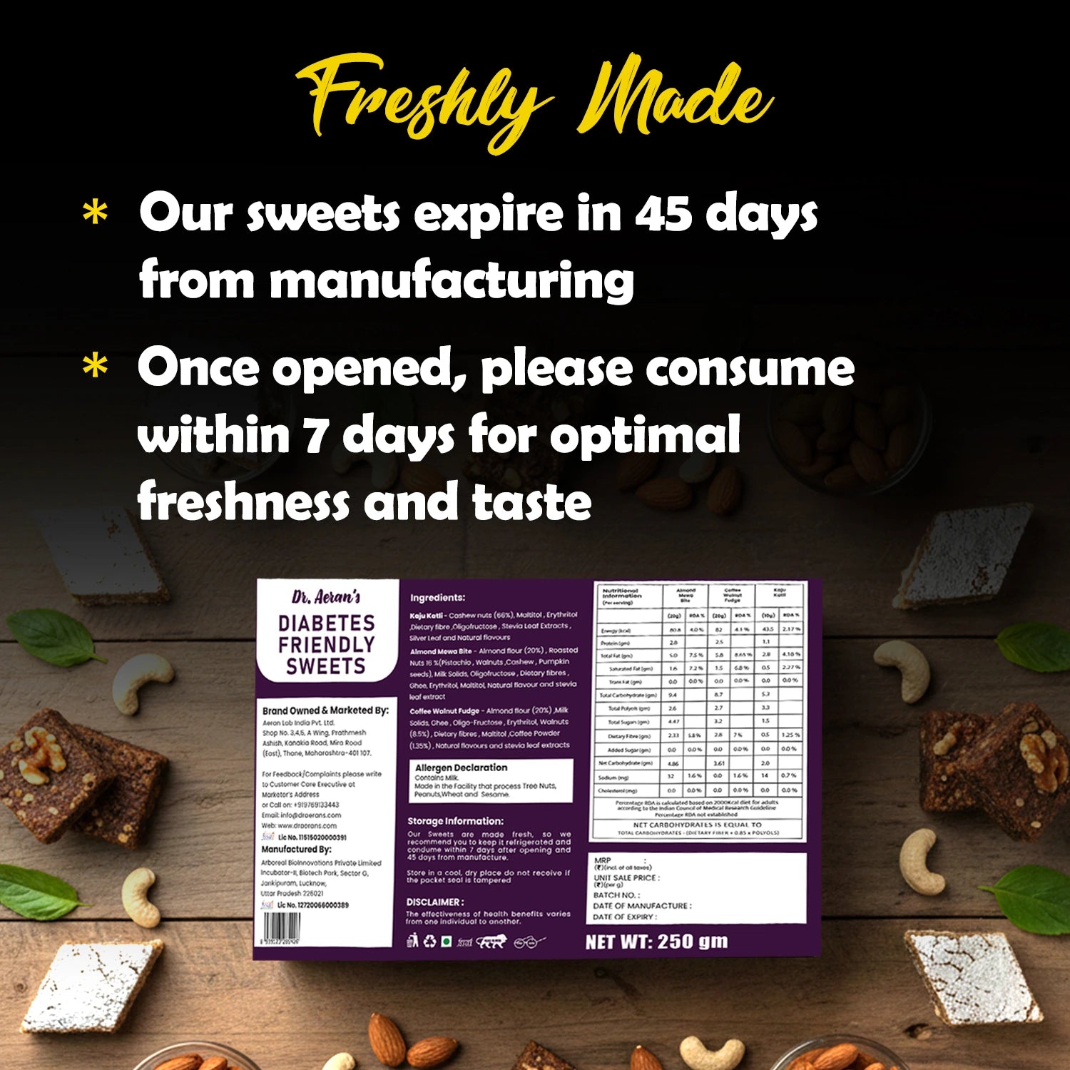 Delicious Sweets with Balanced Sugar Control: Our assorted sweets taste just like the traditional treats but are specially crafted to keep sugar levels in check. Diabetics can enjoy the rich flavors of almond, cashew, and coffee walnut fudge, all without big sugar spikes.